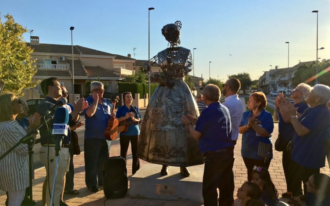 The sculpture of a huertana in embossed iron recalls the 50th anniversary of the group Mar Menor Choirs and Dances, of San Javier