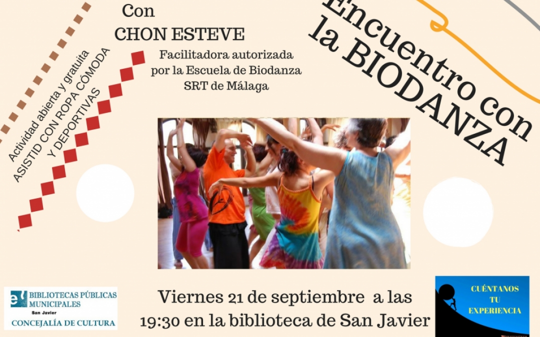 Viernes 21 a las 19:30 en la Biblioteca de San Javier ven a conocer qué es la biodanza y disfruta de una sesión. Imprescinidble ropa cómoda.