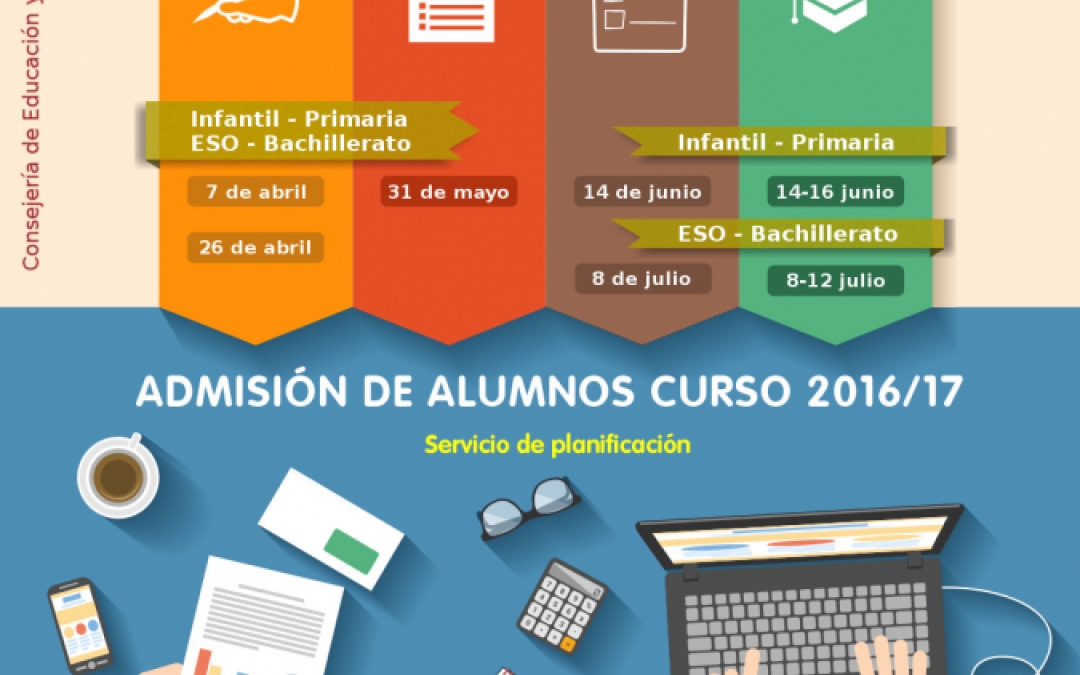 La Consejería de Educación y Universidades, a través de la Dirección General de Planificación y Recursos Humanos, informa a toda la comunidad educativa de los plazos del proceso de admisión escolar para el curso próximo 2016/2017 en centros docentes de enseñanzas de régimen general. Los padres podrán realizar la solicitud de plazas para Educación Infantil, Primaria, Secundaria y Bachillerato del 7 al 26 de abril, preferentemente en el centro de primera opción. El acto de baremación se mantiene por separado de la adjudicación de la plaza, lo que permitirá a las familias comprobar si han sido bien baremadas sus solicitudes en cada uno de los centros solicitados, antes de la adjudicación. El baremo resultante se publicará el 31 de mayo de 2016. La adjudicación de plazas será, en Educación Infantil y Primaria, el 14 de junio y la matrícula en estos niveles se realizará del 14 al 16 de junio. En Educación Secundaria y Bachillerato la adjudicación se realizará el día 8 de julio y la matricula se podrá formalizar entre los días 8 y 12 de julio. La Consejería de Educación y Universidades ha iniciado una campaña en las redes sociales para informar a las familias sobre el proceso de admisión de alumnos para el curso 2016/2017. Los ciudadanos pueden acceder a través de www.educarm.es a toda la información sobre los centros, sus enseñanzas, y todo lo relacionado con el proceso y el calendario de escolarización. Tras la presentación de las solicitudes, las familias podrán conocer a nivel informativo el estado de tramitación en un nuevo apartado de la página web.