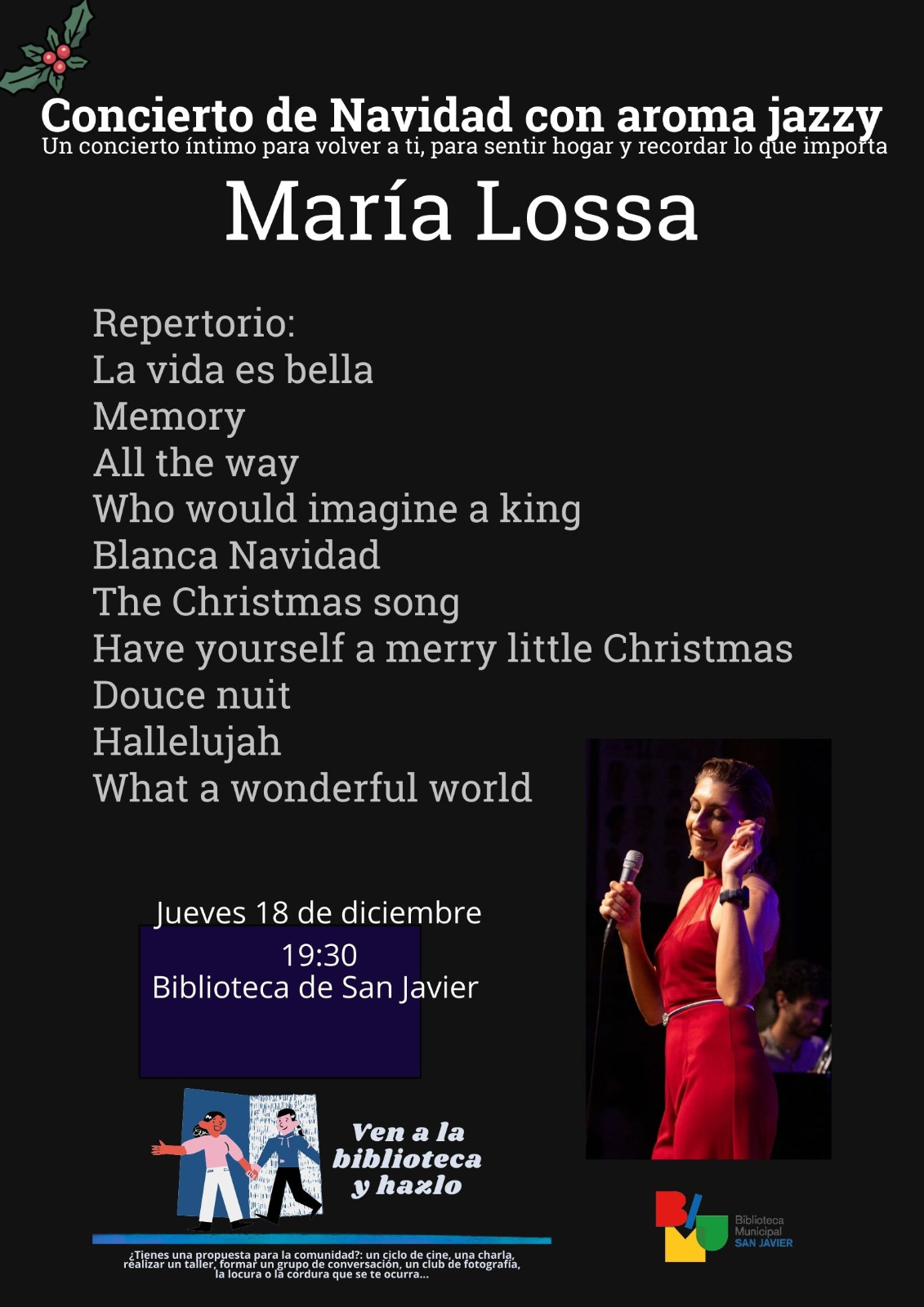 Concierto de Navidad con aroma jazzy. Actuación de María Lossa. Jueves 18 de diciembre a las 19:30 en la biblioteca de San Javier