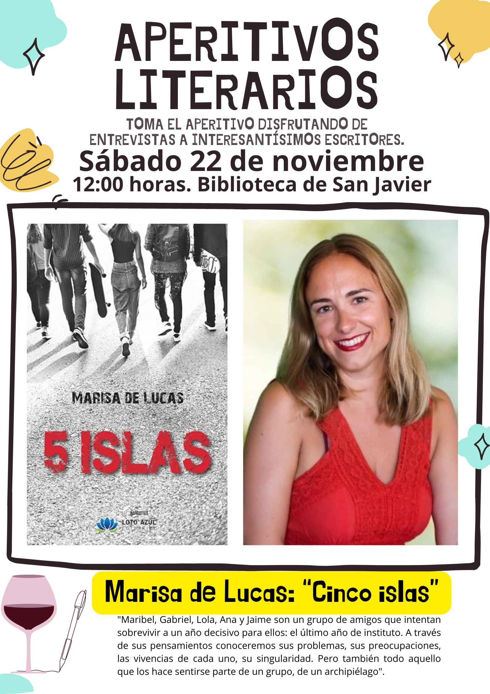 Sábado 22 de noviembre a las 12:00 horas en la biblioteca de San Javier. Aperitivo literario con Marisa de Lucas: Cinco islas.