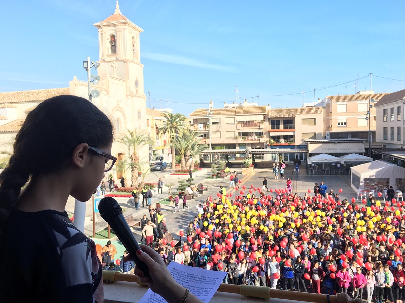Alumnos de los siete colegios del municipio formaron una bandera gigante en la plaza de España donde leyeron un manifiesto homenaje a la Constitución antes de lanzar los globos al son del himno nacional