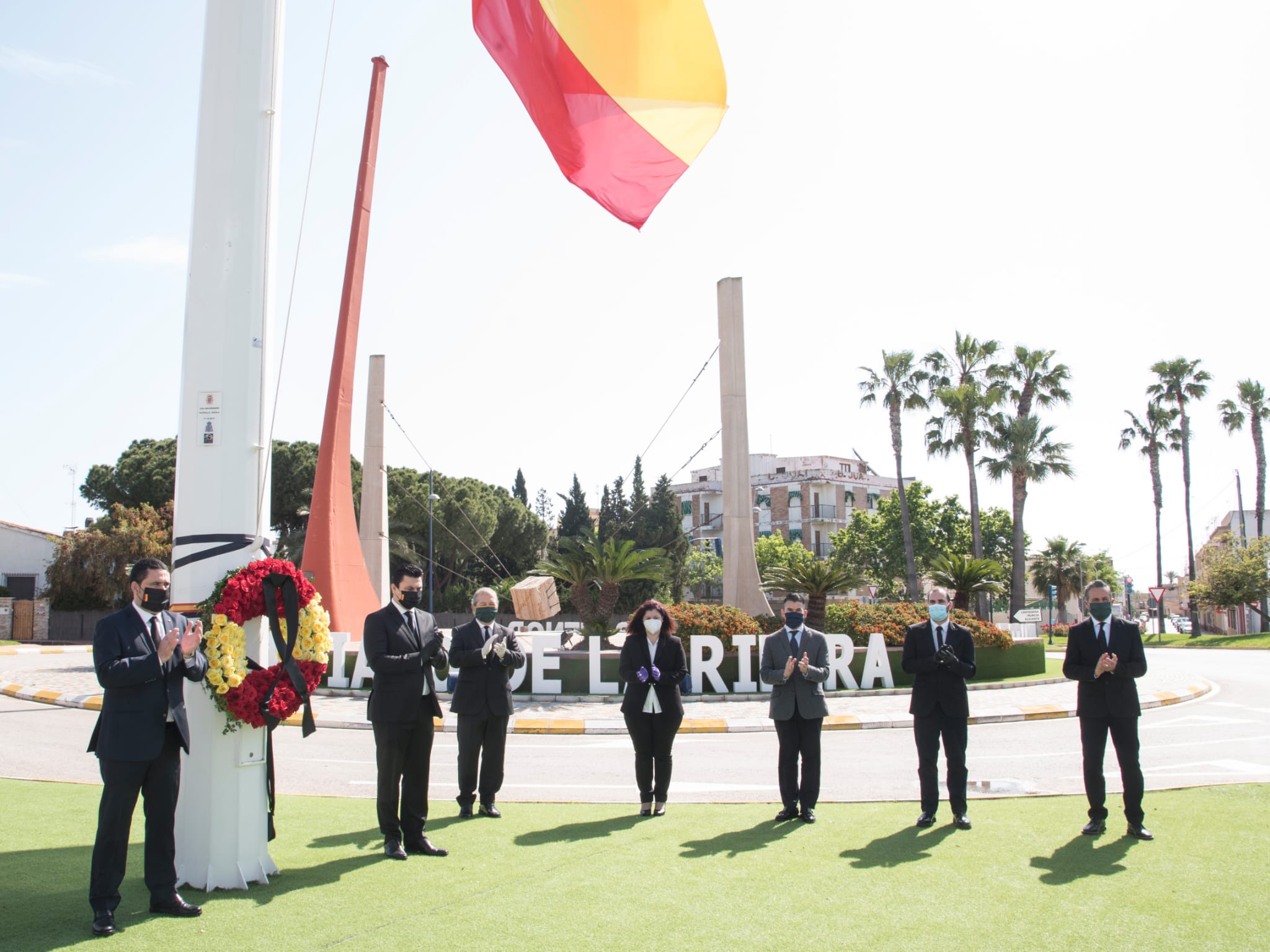 El alcalde acompañado por todos los portavoces políticos municipales colocó una corona de flores con un crespón negro a los pies de la bandera de España de la plaza Puerta del Mar