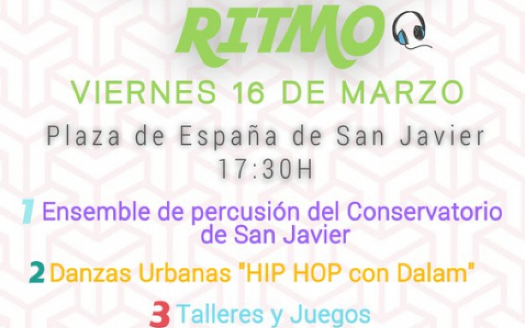 17:30h. Fiesta del Ritmo con Ensemble Percusión del Conservatorio; Danzas urbanas "Hip Hop con Dalam"; talleres y juegos, y globotada. Abierto a todo el público. Organizan alumnos Programa Mixto Empleo-Formación sobre Dinamización infantil y juvenil en tiempo libre. En plaza de España, San Javier.