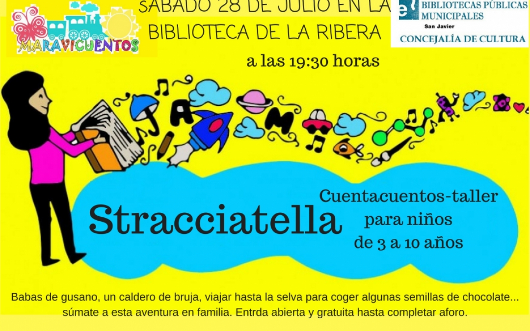 El sábado 28 de Julio a las 19:30 en la biblioteca de Santiago de la Ribera. MARAVICUNETOS nos trae STRACCIATELLA, recomendado por niños de 3 a 10 años.