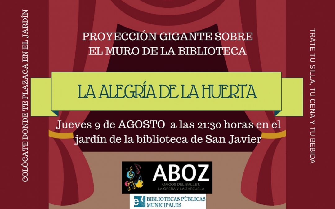 El jueves 9 de agosto a las 21:30 horas en el jardín de la biblioteca de San Javier proyección sobre muro de la zarzuela LA ALEGRÍA DE LA HUERTA