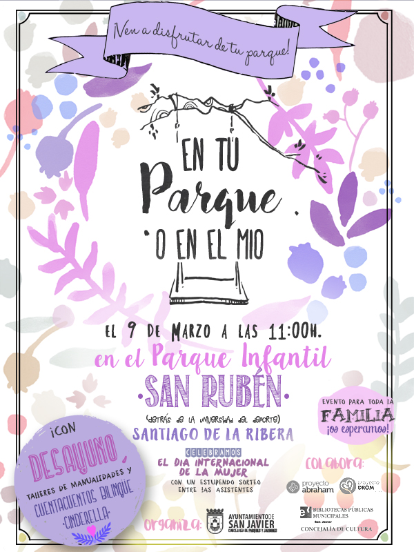 El día 9 de marzo a las 11.00h próximo evento en el PARQUE INFANTIL SAN RUBEN junto a la UNIVERSIDAD DEL DEPORTE en Stgo de la Ribera, con desayuno para toda la familia, taller de manualidades y cuenta cuentos bilingüe "Cinderella". Celebraremos el día de la mujer