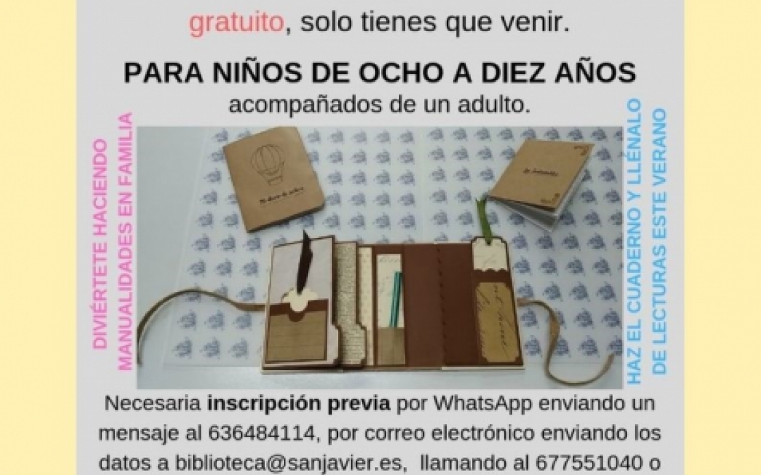 Sábado 20 de Julio de 11:00 a 13:00 horas en la biblioteca de San Javier. Para niños de ocho a diez años acompañados de un adulto. Imprescindible inscripción previa llamando a la biblioteca al 677551040. Plazas muy limitadas.