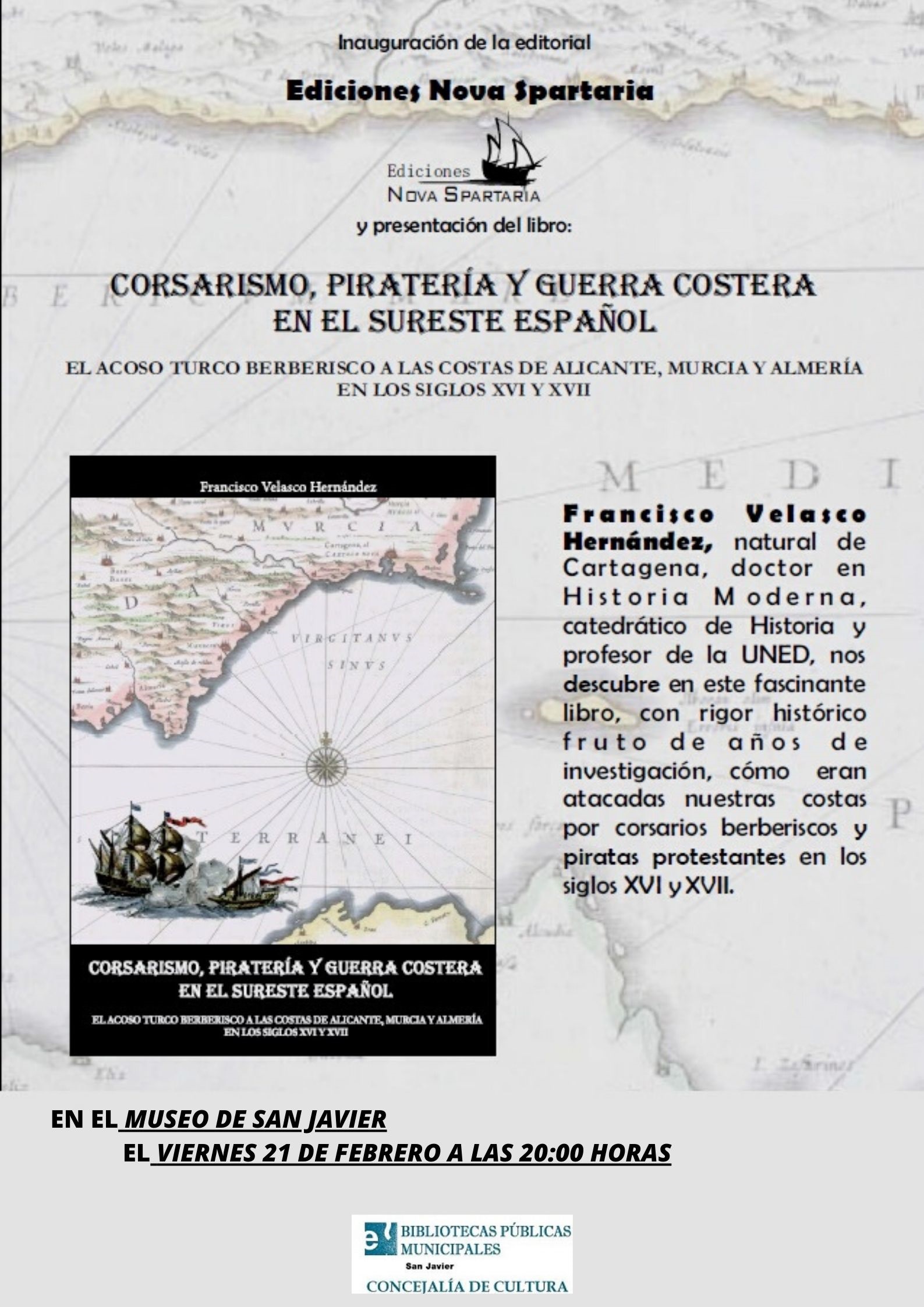 Viernes 21 de febrero a las 20:00 horas en el Museo de San Javier. El Doctor en Historia Francisco Velasco Hernández nos hablará de una frenética, transcendente e interesantísima época histórica que nos toca muy cerca y casi podemos olerla, por que compartimos los mimos paisajes.