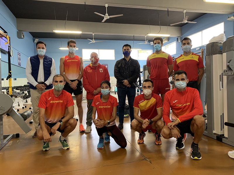 El alcalde saludó y conoció al entrenador, el murciano José Antonio Carrillo y a los 7 deportistas que conforman uno de los grupos burbuja en los que se ha dividido la Selección de atletismo de España para entrenar con las máximas medidas de seguridad sanitaria debido a la pandemia, y evitar las concentraciones masivas.