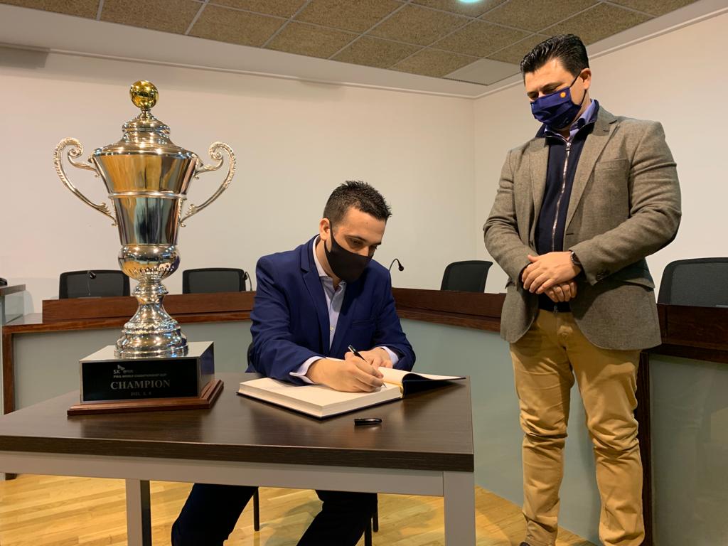 Juan David Zapata agradeció el recibimiento, también en el Libro de Firmas del Ayuntamiento donde dejó su rúbrica junto a otros vecinos y visitantes destacados. El director general de Deportes, Fran Sánchez acudió también a la cita con el campeón cuya victoria lo convirtió también en el jugador que ha ganado el mayor premio económico de la historia en el billar: 225.000 euros.