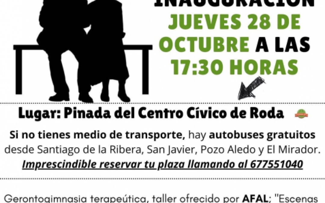 El próximo miércoles 28 de octubre, a las 17:30, en la pinada del Centro Cívico de Roda, inuaguramos uno. Si tienes 65 años o más, te interesa: gerontogimnasia, sketch en panocho, sorteos, merienda, música.