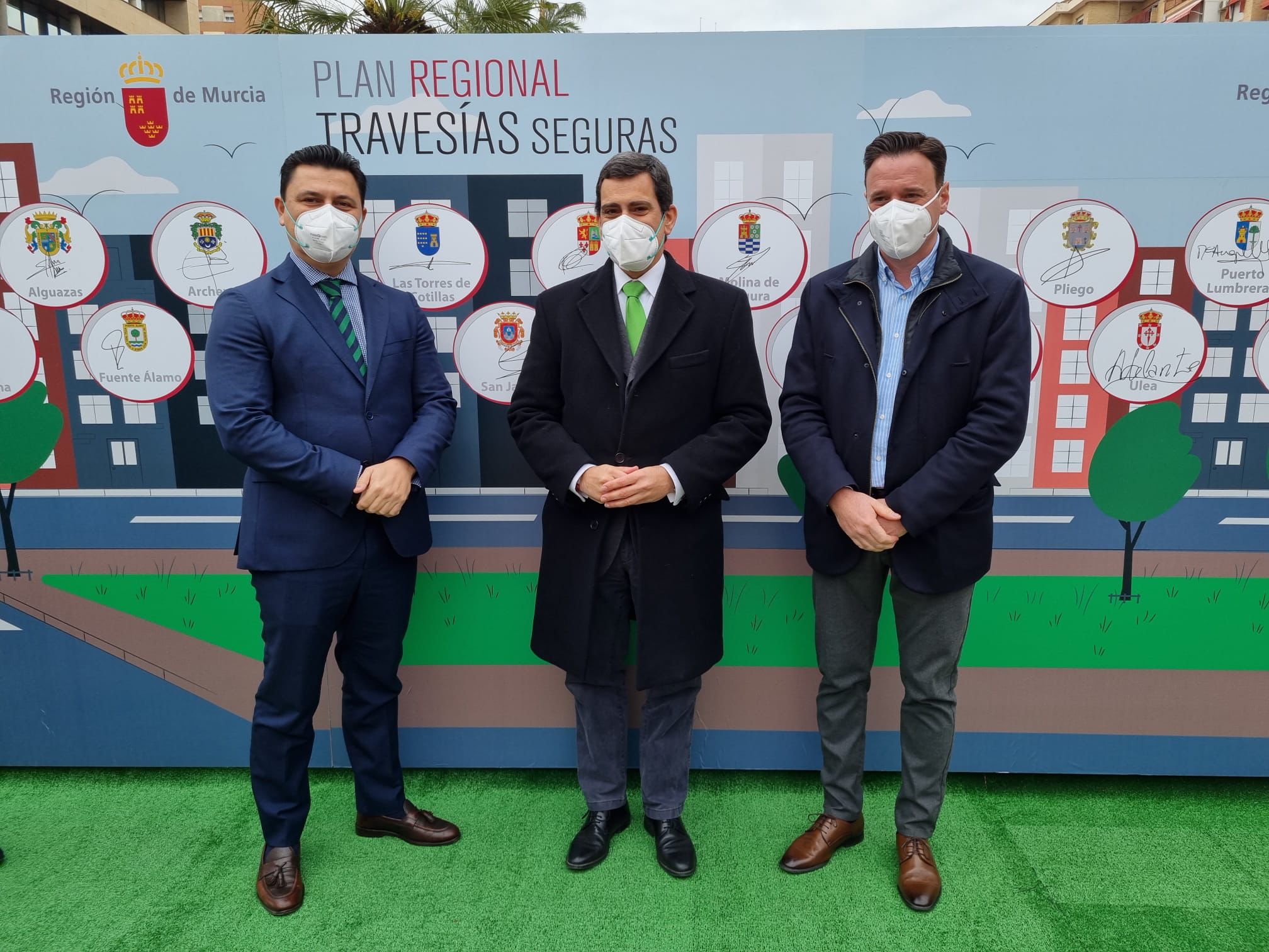 El alcalde de San Javier, José Miguel Luengo ha firmado esta mañana, junto a otros 23 alcaldes de la Región de Murcia, el Plan de Travesías Seguras de la Región de Murcia con el consejero de Fomento e Infraestructuras, José Ramón Díez de Revenga. El Plan supondrá la inyección por parte del Gobierno regional de un total de 9.112.900 euros repartidos en 24 municipios para la mejora de 60 tramos urbanos y un total de 70 kilómetros de carreteras.