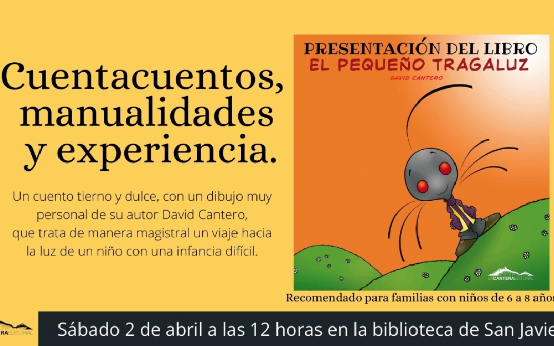 Este sábado 2 de abril a las 12:00 horas en la biblioteca de San Javier, está con nosotros David Cantero, autor de "El pequeño tragaluz", ofreciendo un cuentacuentos con taller muy especial, recomendado para familias con niños de 6 a 8 años. Se trata de una historia dulce y tierna que hará reflexionar a los niños mientras se divierten.