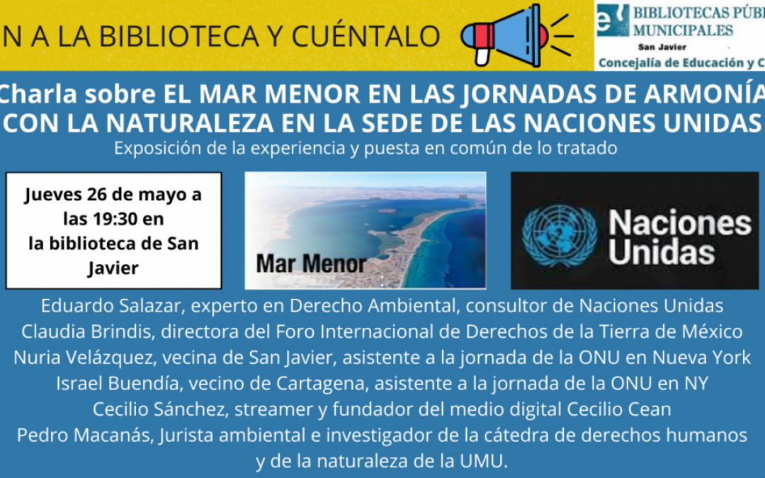 Dentro del programa "Ven a la biblioteca y cuéntalo", en el que la comunidad de San Javier puede compartir sus experiencias y conocimientos, la vecina Nuria Velázquez nos cuenta, junto con otros asistentes y expertos en medio ambiente, su visita a la sede de Naciones Unidas para hablar del Mar Menor dentro de las Jornadas de Armonía con la Naturaleza