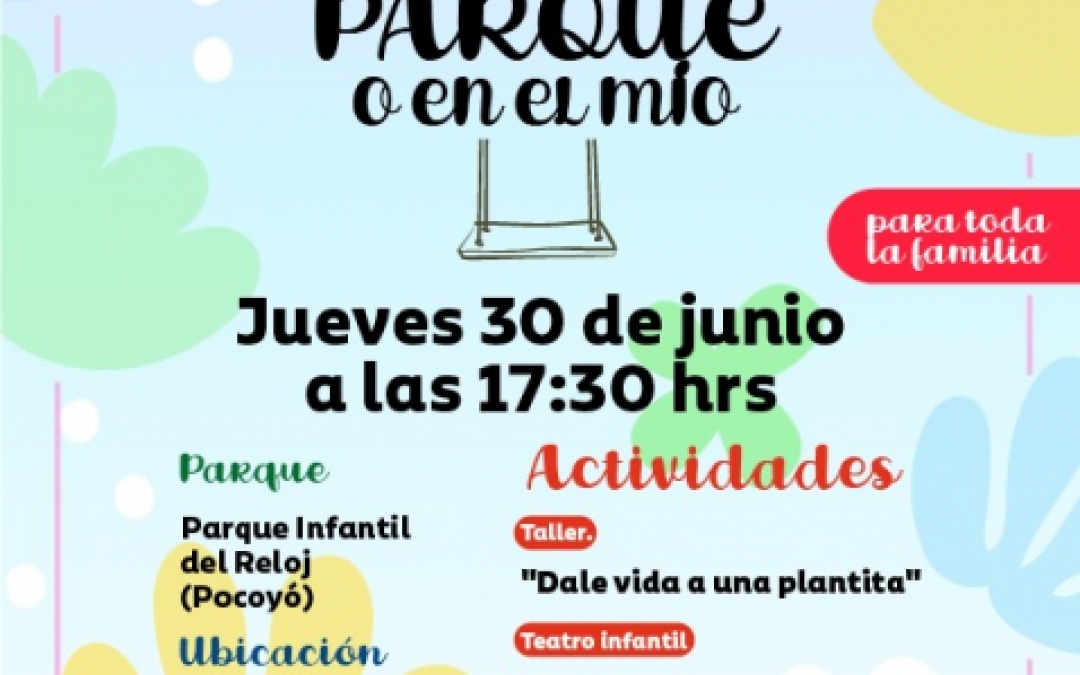 Este jueves 30 de junio a partir de las 17:30, tienes otra actividad del Programa de promoción de parques infantiles "En tu parque o en el mío". Es en el Parque Pocoyó de San Javier y habrá un montón de actividades para familias, entre ellas: tetaro, sorteos, talleres, merienda, musica y hasta libros gratis. Pasa en familia momentos inolvidables en los parques de San Javier. Esta es una actividad de la Concejalía de Parques y Jradines apoyada por otros servicios del Ayuntamiento.