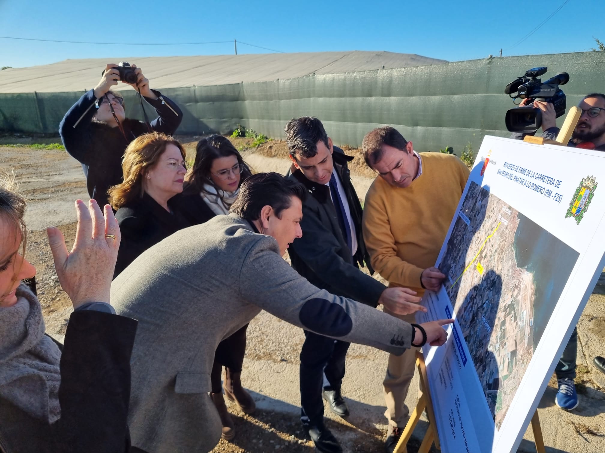 El consejero de Fomento, Juan Ramón Díez de Revenga, junto con los alcaldes de San Pedro del Pinatar, Visitación Martínez, y de San Javier, José Miguel Luengo, presentó hoy el proyecto de mejora “que favorecerá la movilidad segura” dentro de esta vía regional que da acceso a numerosas explotaciones agrícolas pertenecientes a San Javier y al municipio pinatarense y que, al mismo tiempo, comunica con la población del Pinar de Campoverde en la provincia de Alicante.