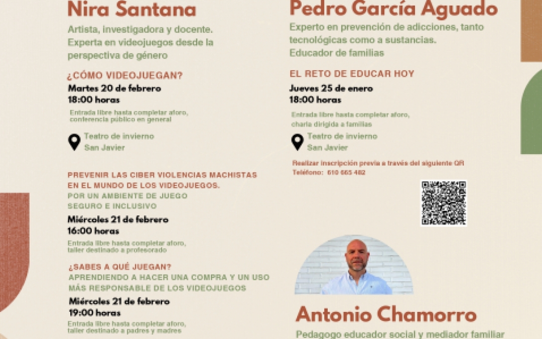 La presencia de Pedro García Aguado en San Javier se enmarca en el “Family Hub”, que ha puesto en marcha la concejalía de Derechos Sociales y Familia, un amplio proyecto sociofamiliar dirigido a niños, adolescentes, de 0 a 17 años, y familias mediante espacios en común, talleres y charlas. Durante el curso académico se han ofertado talleres dirigidos a familias con niños de 0 a 3 años denominados “Espacios de juego en familia” y talleres y ponencias como la de mañana jueves con Pedro García Aguado. El programa de ponencias que se ha denominado “La profesión de ser padres y madres”, incluye la participación de Nira Santa, artistas, investigadora y docente, experta en videojuegos, los días 20 y 21 de febrero, y de Antonio Chamorro, pedagogo, educación social y mediador, el 12 de marzo.