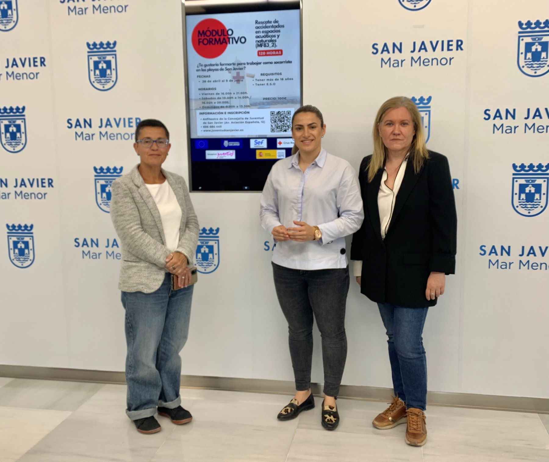 La concejalía de Juventud oferta un módulo formativo de “Rescate de accidentados en espacios acuáticos y naturales”, que impartirán docentes especializados de Cruz Roja, del 26 de abril al 9 de junio en San Javier. La concejala Isabel Madrid y la directora de Formación de Cruz Roja Murcia, Encarna Marín, presentaron hoy el curso de 120 horas, que está dirigido a jóvenes a partir de 16 años y con titulación mínima de ESO.