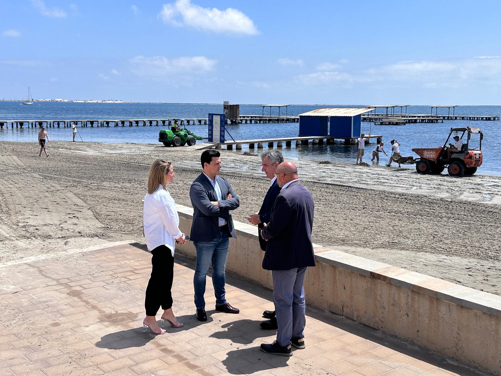 El Gobierno regional invertirá 16 millones de euros hasta 2026 para proseguir con las labores de retirada de biomasa en el litoral del Mar Menor. El consejero de Medio Ambiente, Universidades, Investigación y Mar Menor, Juan María Vázquez, anunció esta mañana la aprobación inminente del contrato y su posterior licitación durante su visita a San Javier donde supervisó los trabajos de reiterada de biomasa, en la playa frente al antiguo hospital Los Arcos, acompañado por el alcalde de San Javier, José Miguel Luengo, la concejala de Turismo y Playas, Estíbaliz Masegosa y el director del Mar Menor, Víctor Serrano.