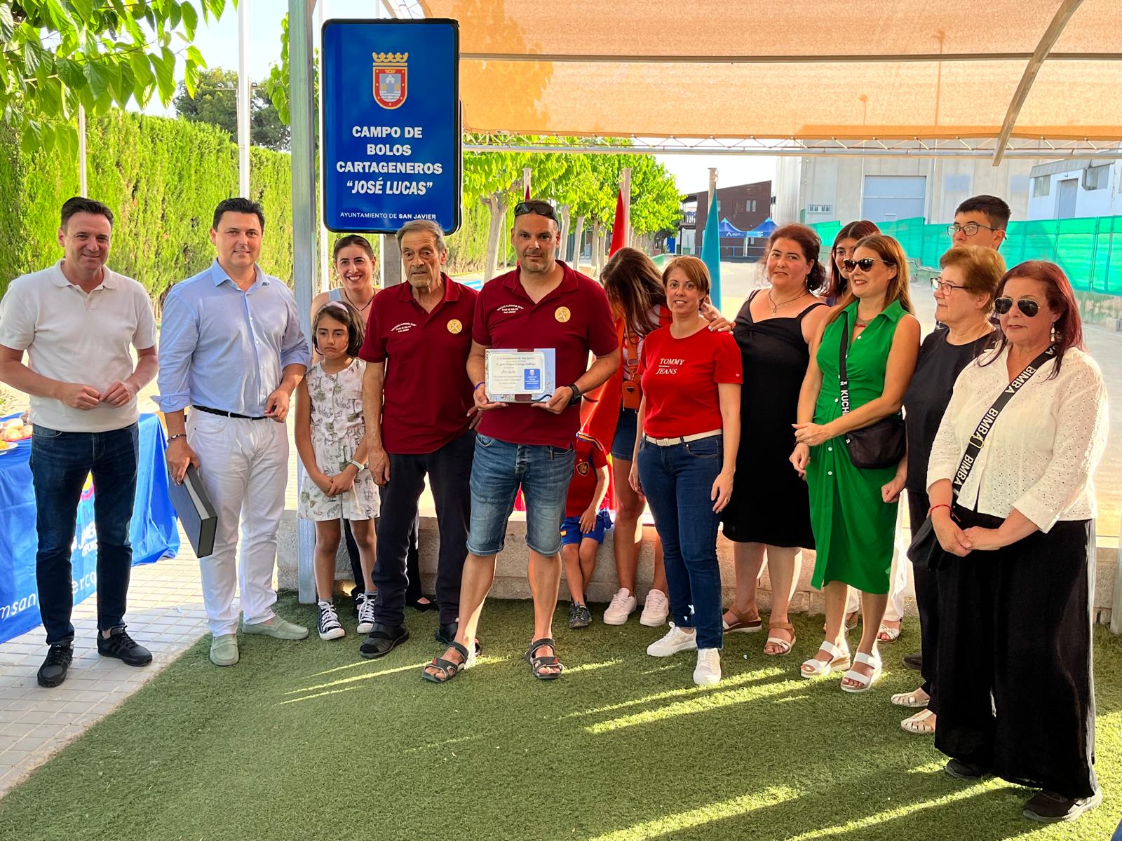 El campo de bolos del polideportivo municipal de San Javier se llama oficialmente desde el pasado viernes, “Campo de Bolos Cartageneros José Lucas”. Así lo pone en la placa que el pasado viernes descubrió el alcalde, José Miguel Luengo junto a los familiares de José Lucas en un acto de homenaje a la persona que trajo al municipio esta modalidad del juego de bolos y por extensión finalmente a los municipios vecinos. El acto contó la participación del concejal de Deportes, Sergio Martínez, familiares, amigos y toda la afición con la que cuentan los bolos cartageneros en el municipio.