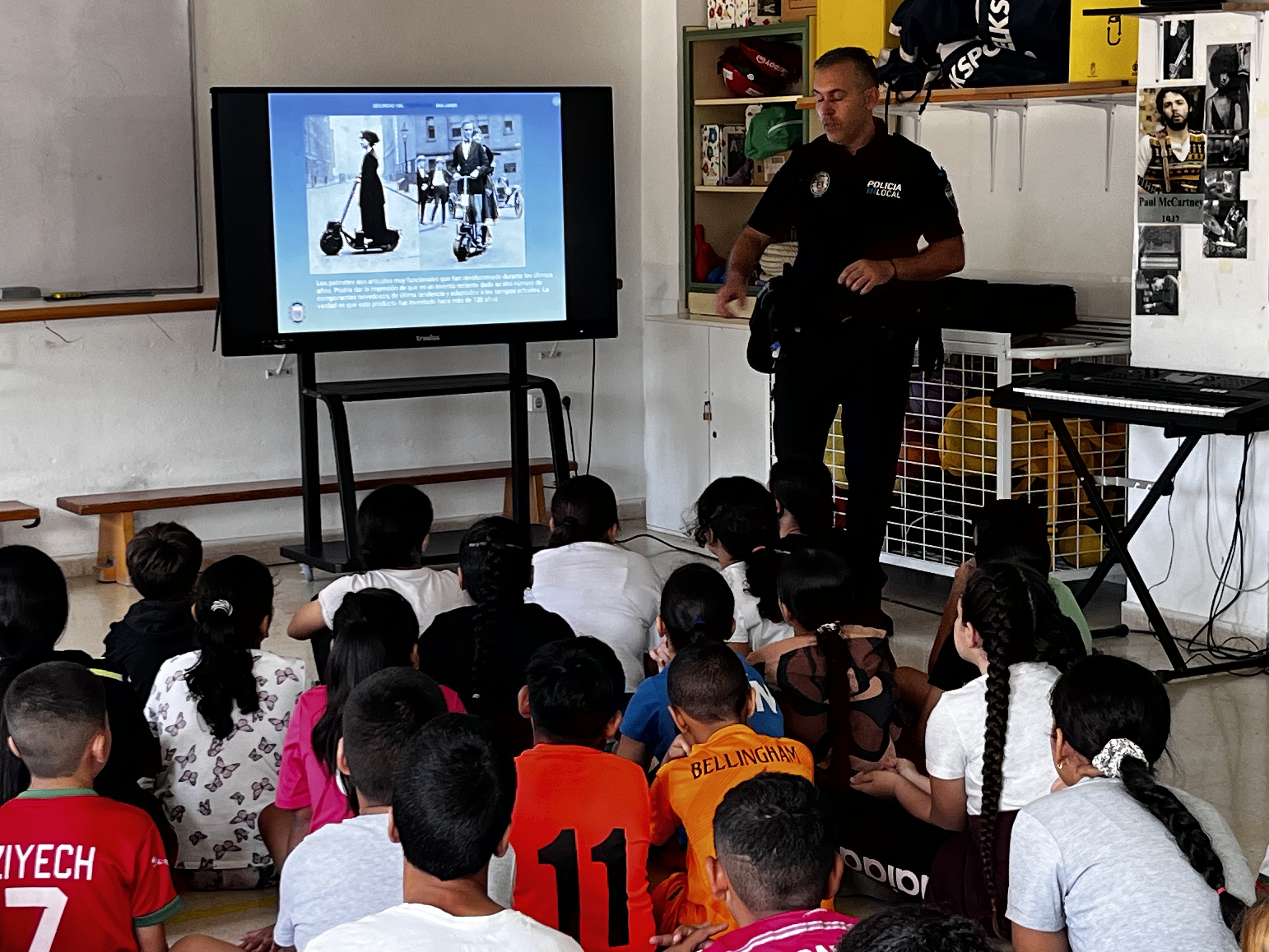 Un agente de Policía Local, que ejerce como Policía Tutor, fue el encargado de hablar con los niños con los que abordó de un modo especial la utilización de patinetes, que regula la Ordenanza Municipal de Movilidad . El Polidía Tutor les recordó que no se pueden utilizar los patinetes hasta los 15 años, ni circular como acompañante o trasladar animales, entre otras cosas como la conveniencia de llevar casco y uso de chaleco reflectante por la noche.