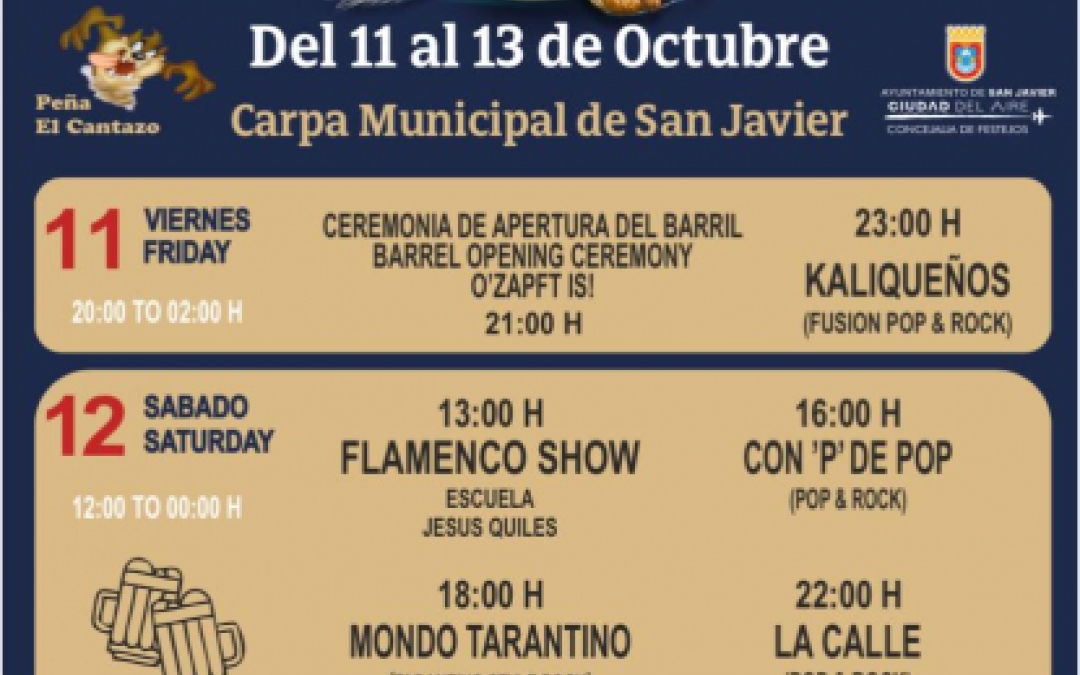 La Oktoberfest, la célebre fiesta de la cerveza que se celebra en la ciudad bávara de Munich, tendrá su eco un año más en San Javier, donde la peña El Cantazo en colaboración con la Concejalía de Festejos vuelve a ponerse manos a la obra para reproducir, de la manera más fiel posible el evento. La carpa municipal de San Javier, ubicada en el Polígono El Pino II, acogerá durante los días 11, 12 y 13 de octubre, el Oktoberfest San Javier 2024, la única que goza del reconocimiento oficial de Paulaner, en la Región de Murcia. Tres tipos de cerveza: Paulaner Lager, Salvator y la tradicional de trigo, además de cervezas “0,0” y sin gluten se servirán acompañando a una variada oferta gastronómica junto a un atractivo cartel musical en directo, que podemos consultar detalladamente.