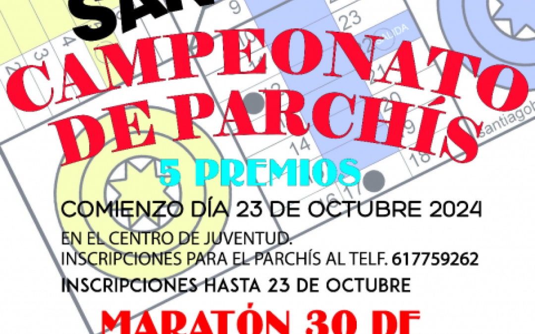 Con el comienzo este miércoles 23 de octubre del tradicional campeonato de parchís, se siente ya en el ambiente, entre las aficionadas y aficionados de San Javier, el calentamiento previo a las fiestas en honor al patrón de San Francisco Javier, La cita es en el salón de actividades múltiples del edificio de juventud a las 21:30 h. Se precisa inscripción previa.