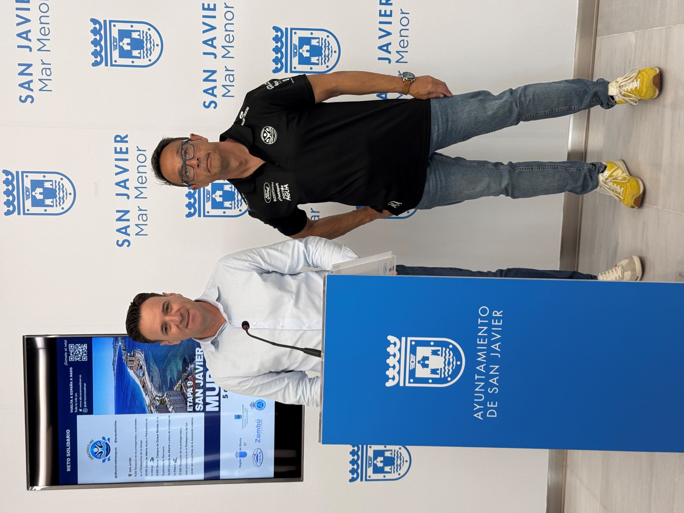 El nadador de larga distancia Alberto Lorente cubrirá en San Javier la 9ª etapa de su nuevo reto solidario “Abracemos el mar” con el que recorre a nado la costa española en doce etapas para concienciar sobre el cuidado del mar. El concejal de Deportes, Sergio Martínez y Francisco Martínez, miembros del equipo del nadador poseedor de cuatro récords Guinness, presentaron la etapa que tendrá lugar en lunes 5 de mayo cuando cruzará el Mar Menor desde la Manga hasta Santiago de la Ribera. La salida tendrá lugar a las 10:00h desde la playa junto al polideportivo municipal y la llegada esta prevista después de unas tres horas y media sobre las 12:30h en la explanada Barnuevo. Por la tarde, a las 17:00h, tendrá lugar una recepción en el Polideportivo municipal de San Javier con la participación de deportistas de la Asociación Aidemar, que se ha implicado en este reto que también cuenta con la colaboración del Ayuntamiento de San Javier, la Comunidad Autónoma de la Región de Murcia y varias empresas locales.