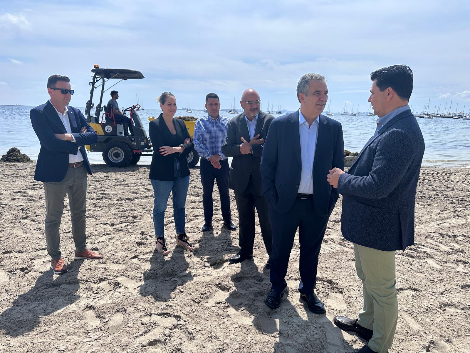 José Miguel Luengo acompañó esta mañana al consejero de Medio Ambiente, Universidades, Investigación y Mar Menor, Juan María Vázquez , durante una visita a las playas de Santiago de la Ribera para comprobar el trabajo que están realizado estos días las brigadas que retiran la biomasa provocada por los arrastres de las lluvias, que conllevan contaminantes como nitratos y fosfatos. En la visita también participaron la concejala de Turismo y Playas, Estíbaliz Masegosa, el alcalde pedáneo de Santiago de la Ribera, Mauricio Ruiz y el concejal de Agricultura, Sergio Martínez. Este año, el Gobierno regional ha intensificado la retirada atendiendo a las recomendaciones científicas, incrementando el número de brigadas operativas en todo el Mar Menor en un 21 por ciento en comparación con el mismo periodo de 2024.