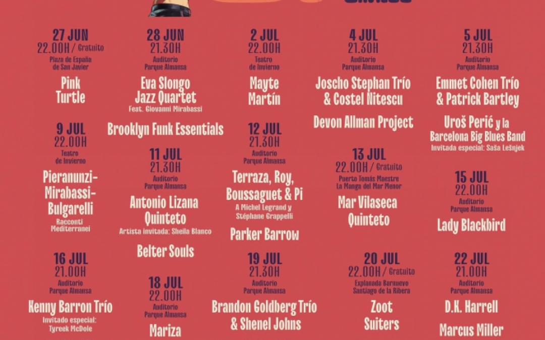 El 27 Festival Internacional de Jazz de San Javier cuenta con la presencia de grandes artistas como Marcus Miller, considerado como el mejor bajista de todos los tiempos, que protagonizará uno de los regresos más esperado. La presencia femenina incluye nombres como el de Lady Blackbird, cantante y compositora estadounidense de jazz y soul, considerada la “Grace Jones del jazz”. También estarán en Jazz San Javier, Mariza, la reina del fado que visitará por primera vez el Festival con el acordeonista portugués Joao Frade como artista invitado, la cantante de soul, Judith Hill, la violinista suiza, Eva Slongo, la inclasificable Mayte Martín y la vocalista e instrumentista Mar Vilaseca, entre otras artistas.