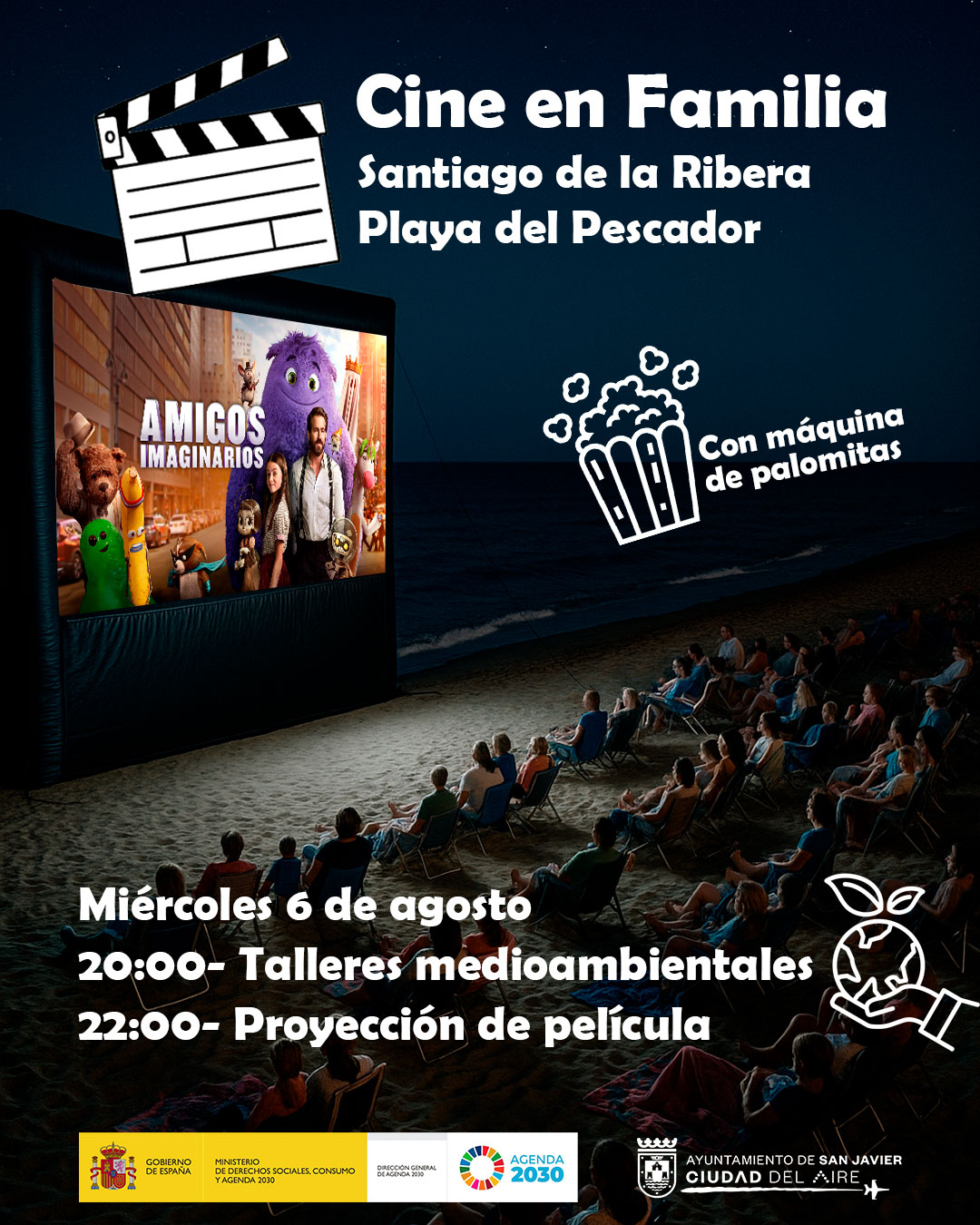 A partir de las 22:00 horas, bajo el cielo estrellado de San Javier, se proyectará la película “Amigos Imaginarios”, una historia entrañable para disfrutar en familia, compartir risas y vivir momentos inolvidables. Durante la proyección, los asistentes podrán disfrutar de palomitas gratis y del ambiente único que ofrecen nuestras playas al anochecer.