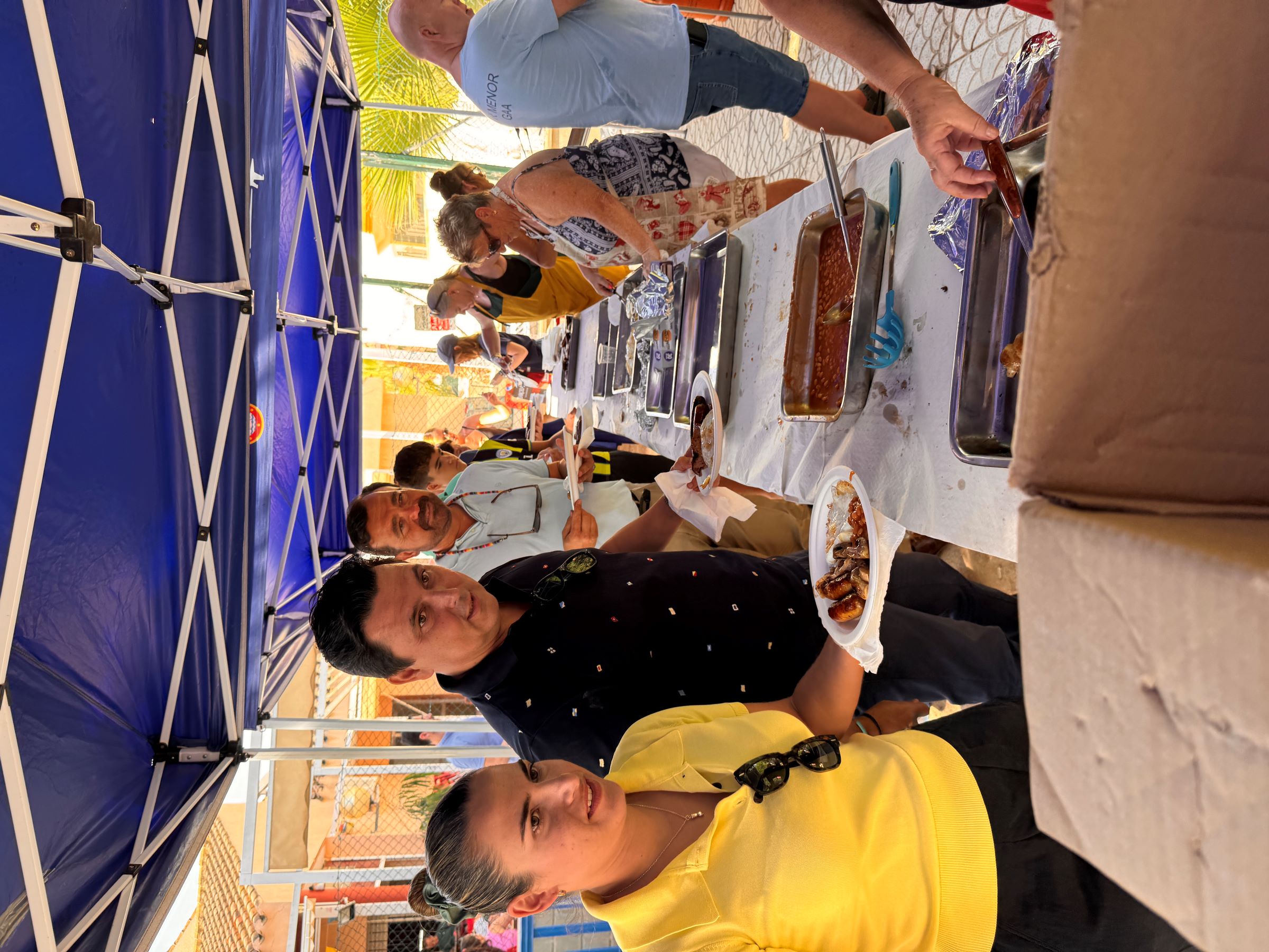El tradicional “desayuno inglés”, que protagoniza el Día Internacional de las fiestas patronales de Roda desde hace 13 años, ha vuelto a congregar a más de 400 personas esta mañana en la pinada de la localidad. La numerosa comunidad extranjera de esta pedanía de San Javier, que cuenta con poco más de 2000 habitantes censados, se ocupa de cocinar y servir el típico “English breakfast”, en el que no faltaba el bacon, las salchichas, el huevo frito, las alubias en salsa de tomate y los champiñones.