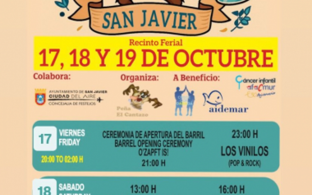 La VI edición del Oktoberfest se celebra una semana después de lo anunciado tras la cancelación por el temporal del pasado fin de semana. El Oktoberfest, que emula la feria de la cerveza de Munich, ofrece comida y cerveza alemana con música en directo todos los días. Es una iniciativa de la peña El Cantazo, que se ocupa de la organización y desarrollo del evento, que se celebra en la carpa municipal de fiestas, en el polígono El Pino. Desde sus inicios tiene carácter benéfico y en esta edición, la peña El Cantazo, ha anunciado que destinará la recaudación a Aidemar y Afacmur, Asociación de Familiares de Niños con Cáncer, de la Región de Murcia.